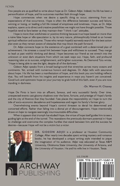Hope De Pinto is born into an affluent, famous, and very successful family. Over time, unexpected events cast gloomy shadows over the fame, fortune, and prestige of Hope's family and the city of Avenice that they founded. Fate places the responsibility on Hope to turn the tide of socio-economic decadence and hopelessness and regain his family's former glory. Overwhelming events beyond Hope's control threaten to derail his determined and concerted efforts. Rather than falling into a dismal pit of discouragement, Hope intentionally draws on hope to navigate seemingly insurmountable difficulties. When it appears that triumph has eluded Hope, the virtue of hope itself guides him to see a guiding light at the end of the tunnel. This reawakens the previously dormant potential in Hope to challenge and overcome the complex hurdles that stand between him and the success he desires-because Hope will not be a victim but a victor.