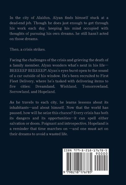 In the city of Alaidun, Alyan finds himself stuck at a dead-end job. Though he does just enough to get through his work each day, keeping his mind occupied with thoughts of pursuing his own dreams, he still hasn't acted on those dreams. Then, a crisis strikes. Facing the challenges of the crisis and grieving the death of a family member, Alyan wonders what's next in his life... BEEEEEP BEEEEEP! Alyan's eyes burst open to the sound of a car outside of his window. He's been recruited to First Fleet Delivery, where he's tasked with delivering items to five cities: Dreamland, Wishland, Tomorrowland, Sorrowland, and Hopeland. As he travels to each city, he learns lessons about its inhabitants-and about himself. Now that the world has paused, how will he seize this chance? Every crisis has both its dangers and its opportunities-it can spell either salvation or doom. Poignant and introspective, Hopeland is a reminder that time marches on -and one must act on their dreams to avoid a wasted life.