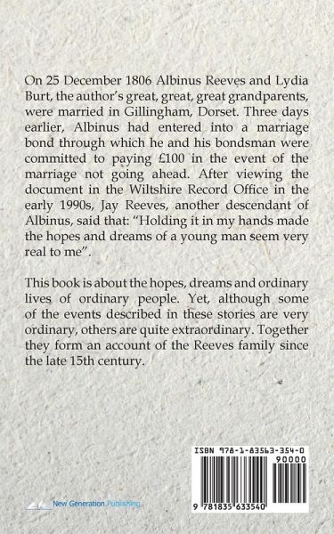 On 25 December 1806 Albinus Reeves and Lydia Burt, the author's great, great, great grandparents, were married in Gillingham, Dorset. Three days earlier, Albinus had entered into a marriage bond through which he and his bondsman were committed to paying £100 in the event of the marriage not going ahead. After viewing the document in the Wiltshire Record Office in the early 1990s, Jay Reeves, another descendant of Albinus, said that: "Holding it in my hands made the hopes and dreams of a young man seem very real to me". This book is about the hopes, dreams and ordinary lives of ordinary people. Yet, although some of the events described in these stories are very ordinary, others are quite extraordinary. Together they form an account of the Reeves family since the late 15th century.