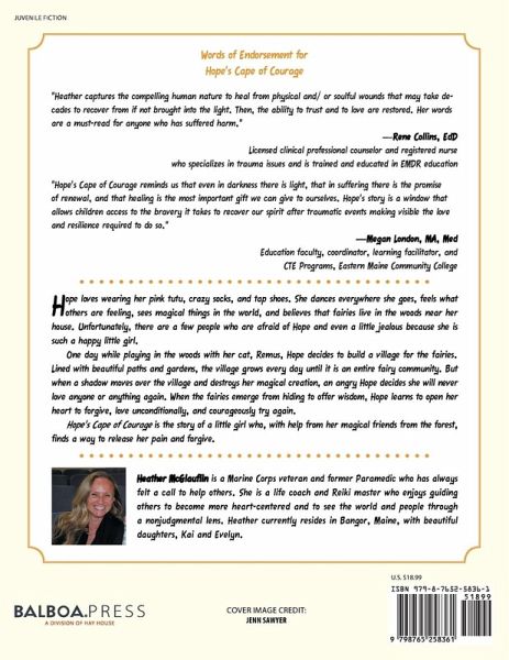 Words of Endorsement for Hope's Cape of Courage "Heather captures the compelling human nature to heal from physical and/ or soulful wounds that may take decades to recover from if not brought into the light. Then, the ability to trust and to love are restored. Her words are a must-read for anyone who has suffered harm." -Rene Collins, EdD Licensed clinical professional counselor and registered nurse who specializes in trauma issues and is trained and educated in EMDR education "Hope's Cape of Courage reminds us that even in darkness there is light, that in suffering there is the promise of renewal, and that healing is the most important gift we can give to ourselves. Hope's story is a window that allows children access to the bravery it takes to recover our spirit after traumatic events making visible the love and resilience required to do so." -Megan London, MA, Med Education faculty, coordinator, learning facilitator, and CTE Programs, Eastern Maine Community College Hope loves wearing her pink tutu, crazy socks, and tap shoes. She dances everywhere she goes, feels what others are feeling, sees magical things in the world, and believes that fairies live in the woods near her house. Unfortunately, there are a few people who are afraid of Hope and even a little jealous because she is such a happy little girl. One day while playing in the woods with her cat, Remus, Hope decides to build a village for the fairies. Lined with beautiful paths and gardens, the village grows every day until it is an entire fairy community. But when a shadow moves over the village and destroys her magical creation, an angry Hope decides she will never love anyone or anything again. When the fairies emerge from hiding to offer wisdom, Hope learns to open her heart to forgive, love unconditionally, and courageously try again. Hope's Cape of Courage is the story of a little girl who, with help from her magical friends from the forest, finds a way to release her pain and forgive.