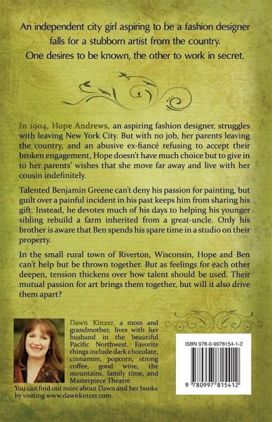 Inspirational Historical Romance Novel In 1904, Hope Andrews, an aspiring fashion designer, struggles with leaving New York City. But with no job, her parents leaving the country, and an abusive ex-fiancé refusing to accept their broken engagement, Hope doesn't have much choice but to give in to her parents' wishes that she move far away and live with her cousin indefinitely. Talented Benjamin Greene can't deny his passion for painting, but guilt over a painful incident in his past keeps him from sharing his gift. Instead, he devotes much of his days to helping his younger sibling rebuild a farm inherited from a great-uncle. Only his brother is aware that Ben spends his spare time in a studio on their property. In the small rural town of Riverton, Wisconsin, Hope and Ben can't help but be thrown together. But as feelings for each other deepen, tension thickens over how talent should be used. Their mutual passion for art brings them together, but will it also drive them apart? BOOK CLUB MEMBERS will find 20+ questions included for discussion and reflection.