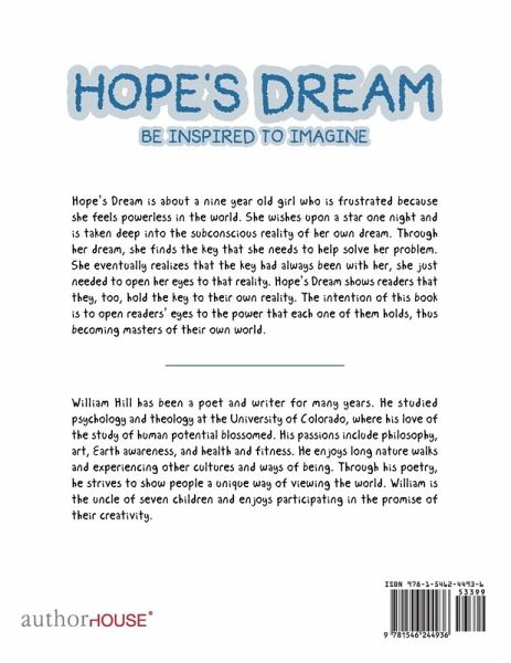 Hope's Dream is about a nine year old girl who is frustrated because she feels powerless in the world. She wishes upon a star one night and is taken deep into the subconscious reality of her own dream. Through her dream, she finds the key that she needs to help solve her problem. She eventually realizes that the key had always been with her, she just needed to open her eyes to that reality. Hope's Dream shows readers that they, too, hold the key to their own reality. The intention of this book is to open readers' eyes to the power that each one of them holds, thus becoming masters of their own world.