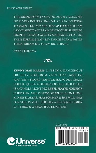 THIS DREAM BOOK HOPES, DREAMS & VISIONS PER GD IS VERY INTERESTING. WHAT IS GOD TRYING TO WARN, TELL ME? ARE DREAMS PROPHETIC? AM I AN CLAIRVOYANT? I AM KIN TO THE SLEEPING PROPHET EDGAR CAYCE BY MARRIAGE. WHAT DO THESE DREAMS MEAN? REV. DANIELS CAN ANALYZE THEM. DREAM BIG! CLAIM BIG THINGS. SWEET DREAMS.