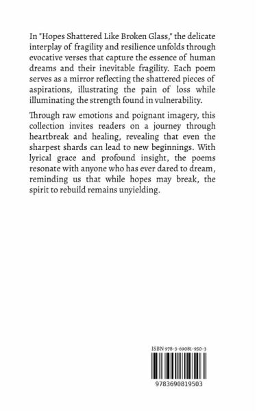 In "Hopes Shattered Like Broken Glass," the delicate interplay of fragility and resilience unfolds through evocative verses that capture the essence of human dreams and their inevitable fragility. Each poem serves as a mirror reflecting the shattered pieces of aspirations, illustrating the pain of loss while illuminating the strength found in vulnerability. Through raw emotions and poignant imagery, this collection invites readers on a journey through heartbreak and healing, revealing that even the sharpest shards can lead to new beginnings. With lyrical grace and profound insight, the poems resonate with anyone who has ever dared to dream, reminding us that while hopes may break, the spirit to rebuild remains unyielding.