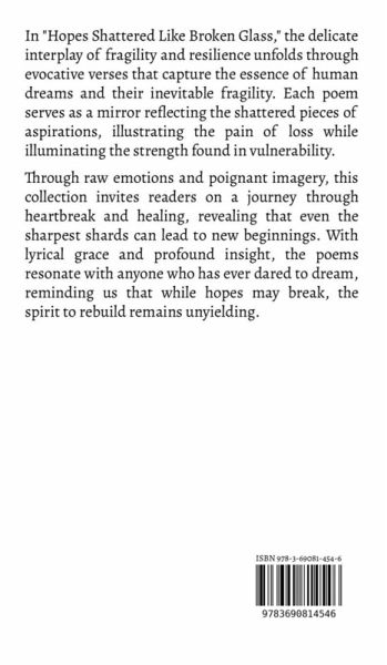In "Hopes Shattered Like Broken Glass," the delicate interplay of fragility and resilience unfolds through evocative verses that capture the essence of human dreams and their inevitable fragility. Each poem serves as a mirror reflecting the shattered pieces of aspirations, illustrating the pain of loss while illuminating the strength found in vulnerability. Through raw emotions and poignant imagery, this collection invites readers on a journey through heartbreak and healing, revealing that even the sharpest shards can lead to new beginnings. With lyrical grace and profound insight, the poems resonate with anyone who has ever dared to dream, reminding us that while hopes may break, the spirit to rebuild remains unyielding.