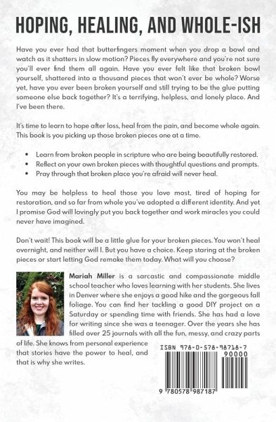 Have you ever had that butterfingers moment when you drop a bowl and watch as it shatters in slow motion? Pieces fly everywhere and you're not sure you'll ever find them all again. Have you ever felt like that broken bowl yourself, shattered into a thousand pieces that won't ever be whole? Worse yet, have you ever been broken yourself and still trying to be the glue putting someone else back together? It's a terrifying, helpless, and lonely place. And I've been there. It's time to learn to hope after loss, heal from the pain, and become whole again. This book is you picking up those broken pieces one at a time. * Learn from broken people in scripture who are being beautifully restored. * Reflect on your own broken pieces with thoughtful questions and prompts. * Pray through that broken place you're afraid will never heal. You may be helpless to heal those you love most, tired of hoping for restoration, and so far from whole you've adopted a different identity. And yet I promise God will lovingly put you back together and work miracles you could never have imagined. Don't wait! This book will be a little glue for your broken pieces. You won't heal overnight, and neither will I. But you have a choice. Keep staring at the broken pieces or start letting God remake them today. What will you choose?