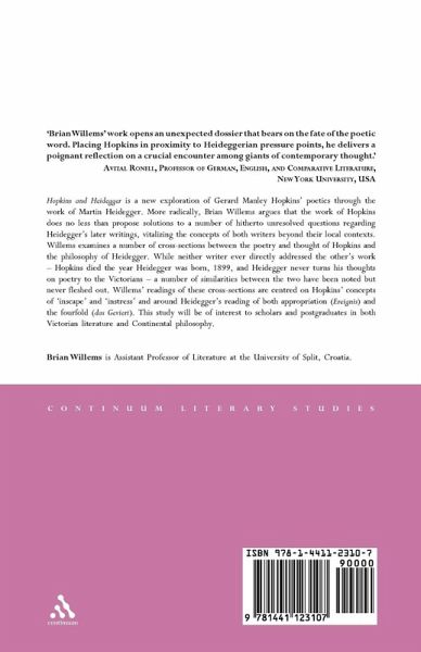 Hopkins and Heidegger is a new exploration of Gerard Manley Hopkins' poetics through the work of Martin Heidegger. More radically, Brian Willems argues that the work of Hopkins does no less than propose solutions to a number of hitherto unresolved questions regarding Heidegger's later writings, vitalizing the concepts of both writers beyond their local contexts. Willems examines a number of cross-sections between the poetry and thought of Hopkins and the philosophy of Heidegger. While neither writer ever directly addressed the other's work - Hopkins died the year Heidegger was born, 1899, and Heidegger never turns his thoughts on poetry to the Victorians - a number of similarities between the two have been noted but never fleshed out. Willems' readings of these cross-sections are centred on Hopkins' concepts of 'inscape' and 'instress' and around Heidegger's reading of both appropriation (Ereignis) and the fourfold (das Geviert). This study will be of interest to scholars and postgraduates in both Victorian literature and Continental philosophy.