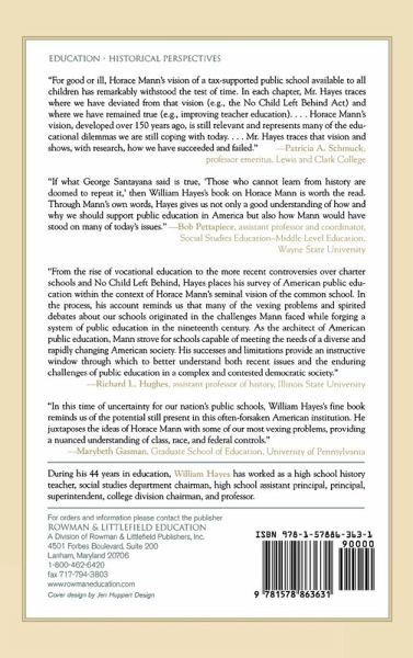 From the rise of vocational education to the more recent controversies over charter schools and 'No Child Left Behind,' Hayes places his survey of American public education within the context of Horace Mann's seminal vision of the common school. In the process, his account reminds us that many of the vexing problems and spirited debates about our schools originated in the challenges Mann faced while forging a system of public education in the nineteenth century. As the architect of American public education, Mann strove for schools capable of meeting the needs of a diverse and rapidly changing American society. His successes and limitations provide an instructive window through which to better understand both recent issues and the enduring challenges of public education in a complex and contested democratic society. -- Dr. Richard L. Hughes, assistant professor of History, Illinois State University If what George Santayana said is true, 'Those who cannot learn from history are doomed to repeat it' ,then William Hayes' book on Horace Mann is worth the read. Hayes gives us not only a good understanding through Mann's own words, of how and why we should support public education in America, but how Mann may stand on many of today's issues. -- Bob Pettapiece, assistant professor & coordinator, Social Studies Education-Middle Level Education, Wayne State University For good or ill, Horace Mann's vision of a tax-supported public school available to all children, has remarkably withstood the test of time. In each chapter Mr. Hayes traces where we have deviated from that vision (such as No Child Left Behind) and where we have remained true (such as improving teacher education)...Horace Mann's vision developed over 150 years ago is still relevant and represents many of the educational dilemmas we are still coping with today...Mr. Hayes traces that vision and shows, with research, how we have succeeded and failed. -- Patricia A. Schmuck, professor emeritus, Lewis and Clark College Hayes argues that at their core, the concepts about public education Horace Mann endorsed 150 years ago still hold true. Mann held public schools should be nonsectarian but teach a common morality, be locally managed but state regulated, and be tax-supported and free while providing equal educational opportunities to all children. Reference and Research Book News Horace Mann's Vision does succinctly summarize current controversies in education including technology, school finance, and No Child Left Behind, and the writing is informed. Educational Horizons Magazine In this time of uncertainty for our nation's public school, William Hayes' fine book reminds us of the potential still present in this often forsaken American institution. He juxtaposes the ideas of Horace Mann with some of our most vexing problems, providing a nuanced understanding of class, race, and federal controls. -- Marybeth Gasman, Graduate School of Education, University of Pennsylvania