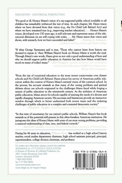 From the rise of vocational education to the more recent controversies over charter schools and 'No Child Left Behind,' Hayes places his survey of American public education within the context of Horace Mann's seminal vision of the common school. In the process, his account reminds us that many of the vexing problems and spirited debates about our schools originated in the challenges Mann faced while forging a system of public education in the nineteenth century. As the architect of American public education, Mann strove for schools capable of meeting the needs of a diverse and rapidly changing American society. His successes and limitations provide an instructive window through which to better understand both recent issues and the enduring challenges of public education in a complex and contested democratic society. -- Dr. Richard L. Hughes, assistant professor of History, Illinois State University If what George Santayana said is true, 'Those who cannot learn from history are doomed to repeat it' ,then William Hayes' book on Horace Mann is worth the read. Hayes gives us not only a good understanding through Mann's own words, of how and why we should support public education in America, but how Mann may stand on many of today's issues. -- Bob Pettapiece, assistant professor & coordinator, Social Studies Education-Middle Level Education, Wayne State University For good or ill, Horace Mann's vision of a tax-supported public school available to all children, has remarkably withstood the test of time. In each chapter Mr. Hayes traces where we have deviated from that vision (such as No Child Left Behind) and where we have remained true (such as improving teacher education)...Horace Mann's vision developed over 150 years ago is still relevant and represents many of the educational dilemmas we are still coping with today...Mr. Hayes traces that vision and shows, with research, how we have succeeded and failed. -- Patricia A. Schmuck, professor emeritus, Lewis and Clark College Hayes argues that at their core, the concepts about public education Horace Mann endorsed 150 years ago still hold true. Mann held public schools should be nonsectarian but teach a common morality, be locally managed but state regulated, and be tax-supported and free while providing equal educational opportunities to all children. Reference and Research Book News Horace Mann's Vision does succinctly summarize current controversies in education including technology, school finance, and No Child Left Behind, and the writing is informed. Educational Horizons Magazine In this time of uncertainty for our nation's public school, William Hayes' fine book reminds us of the potential still present in this often forsaken American institution. He juxtaposes the ideas of Horace Mann with some of our most vexing problems, providing a nuanced understanding of class, race, and federal controls. -- Marybeth Gasman, Graduate School of Education, University of Pennsylvania