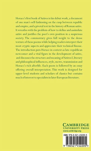 Horace's first book of Satires is his debut work, a document of one man's self-fashioning on the cusp between republic and empire, and a pivotal text in the history of Roman satire. It wrestles with the problem of how to define and assimilate satire and justifies the poet's own position in a suspicious society. The commentary gives full weight to the dense texture of these poems while helping readers interpret their most cryptic aspects and appreciate their technical finesse. The introduction puts Horace in context as late-Republican newcomer and a vital figure in the development of satire, and discusses the structure and meaning of Satires I, literary and philosophical influences, style, metre, transmission and Horace's rich afterlife. Each poem is followed by an essay offering overall interpretation. This work is designed for upper-level students and scholars of classics but contains much of interest to specialists in later European literature.