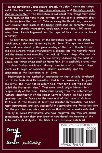 In the Revelation Jesus speaks directly to John: "Write the things which thou hast seen, and the things which are, and the things which shall be hereafter;" The Revelation is not about "the things that were" or the past, at the time it was written. If this book is primarily about the future from the time of John receiving the Revelation, then we must consider that much of the things which shall be hereafter having commenced shortly thereafter, would now, in our time, 1900 years later, have already happened over that span of time, and can be found in history. The first three chapters of the Revelation relate to the things which are, at the time of writing by St. John. The epistles should be read and understood by the plain reading of the text. Chapters four and five concern things otherworldly: a glimpse into the heavenly realm and the drama about unsealing the book of future things. Chapters six through nineteen concern the future history unsealed by the Lamb or Jesus, the things which shall be Hereafter. It is explicitly stated that it is about "things which must shortly come to pass" - future things which would begin, or commence almost immediately upon the completion of the Revelation to St. John. Historicism is the method of interpretation that actually developed out of the Protestant Reformation, that is the reason why, to quote one critic, the "view was so widely held, that for a long time it was called the Protestant view." That alone should pique interest to a deeper study of the view. The Council of Trent and Counter-Reformation has been most instrumental and very successful in suppressing this Protestant view for the past two centuries, so much so that it can be easily ridiculed even by so-called Protestants, who have forgotten why they are called protestant, if ever they even knew or considered the meaning of the Reformed Protest Against the Biblical and Historical Antichrist. This edition brings the nearly 170 years of history that has followed E. B. Elliot's 5th edition into view with updates and revisions necessary to the same method of interpretation employed by the original work, with what conclusions we believe the original author would have come to if he could have seen what history has unfolded since.
