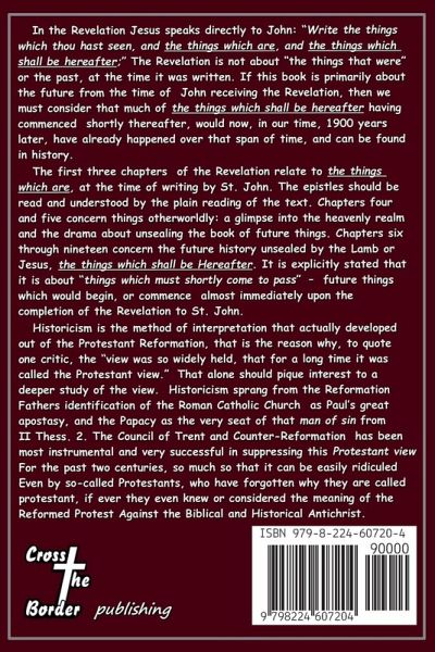In the Revelation Jesus speaks directly to John: "Write the things which thou hast seen, and the things which are, and the things which shall be hereafter;" The Revelation is not about "the things that were" or the past, at the time it was written. If this book is primarily about the future from the time of John receiving the Revelation, then we must consider that much of the things which shall be hereafter having commenced shortly thereafter, would now, in our time, 1900 years later, have already happened over that span of time, and can be found in history. The first three chapters of the Revelation relate to the things which are, at the time of writing by St. John. The epistles should be read and understood by the plain reading of the text. Chapters four and five concern things otherworldly: a glimpse into the heavenly realm and the drama about unsealing the book of future things. Chapters six through nineteen concern the future history unsealed by the Lamb or Jesus, the things which shall be Hereafter. It is explicitly stated that it is about "things which must shortly come to pass" - future things which would begin, or commence almost immediately upon the completion of the Revelation to St. John. Historicism is the method of interpretation that actually developed out of the Protestant Reformation, that is the reason why, to quote one critic, the "view was so widely held, that for a long time it was called the Protestant view." That alone should pique interest to a deeper study of the view. The Council of Trent and Counter-Reformation has been most instrumental and very successful in suppressing this Protestant view for the past two centuries, so much so that it can be easily ridiculed even by so-called Protestants, who have forgotten why they are called protestant, if ever they even knew or considered the meaning of the Reformed Protest Against the Biblical and Historical Antichrist. This edition brings the nearly 170 years of history that has followed E. B. Elliot's 5th edition into view with updates and revisions necessary to the same method of interpretation employed by the original work, with what conclusions we believe the original author would have come to if he could have seen what history has unfolded since.
