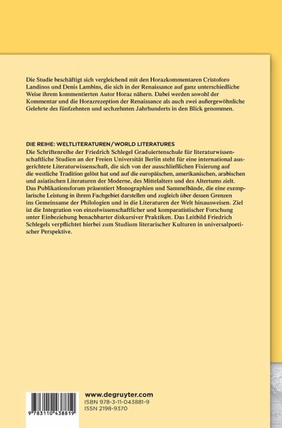 Die Untersuchung widmet sich dem Vergleich von Kommentierungsstrategien in der Renaissance am Beispiel der bisher wenig beachteten Horazkommentare des Cristoforo Landino von 1482 und des Denis Lambin von 1561, die in ihrem Verhältnis zum kommentierten Autor stark kontrastieren. Im ersten Teil liegt der Fokus auf den autorisierenden Paratexten beider Editionen. Landino zeigt sich als Kommentator, der sich als Teil der Dichtungstradition versteht. Lambin hingegen stellt seine Selbststilisierung in den Vordergrund. Im zweiten Teil werden diejenigen Passagen vergleichend analysiert, die die Kommentatoren aufgrund ihres intellektuellen Umfelds vor sprachliche und inhaltliche Herausforderungen stellen: obszöne und epikureische Passagen. Anhand dieser Textstellen kristallisiert sich eine eindeutige Verschiebung im Verhältnis zwischen Autor, Kommentator und Leser heraus: Landino glättet Horaz und schützt seine Leser. Lambin hingegen entzieht sich dieser Verantwortung und konfrontiertseine Leser mit Anstößigkeiten. Dabei werden exemplarisch Entwicklungen im Genre des Kommentars zwischen dem fünfzehnten und sechzehnten Jahrhundert und die Vielseitigkeit der rinascimentalen Horazrezeption sichtbar.