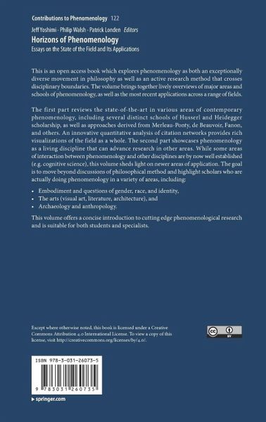 This is an open access book which explores phenomenology as both an exceptionally diverse movement in philosophy as well as an active research method that crosses disciplinary boundaries. The volume brings together lively overviews of major areas and schools of phenomenology, as well as the most recent applications across a range of fields. The first part reviews the state-of-the-art in various areas of contemporary phenomenology, including several distinct schools of Husserl and Heidegger scholarship, as well as approaches derived from Merleau-Ponty, de Beauvoir, Fanon, and others. An innovative quantitative analysis of citation networks provides rich visualizations of the field as a whole. The second part showcases phenomenology as a living discipline that can advance research in other areas. While some areas of interaction between phenomenology and other disciplines are by now well established (e.g. cognitive science), this volume sheds light on newer areas of application. The goal is to move beyond discussions of philosophical method and highlight scholars who are actually doing phenomenology in a variety of areas, including: