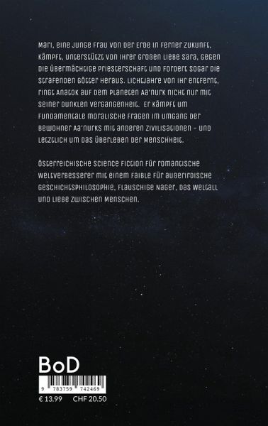Mári, eine junge Frau von der Erde in ferner Zukunft, kämpft, unterstützt von ihrer großen Liebe Sara, gegen die übermächtige Priesterschaft und fordert sogar die strafenden Götter heraus. Lichtjahre von ihr entfernt, ringt Anatok auf dem Planeten Aa'nurk nicht nur mit seiner dunklen Vergangenheit. Er kämpft um fundamentale moralische Fragen im Umgang der Bewohner Aa'nurks mit anderen Zivilisationen - und letztlich um das Überleben der Menschheit. Österreichische Science Fiction für romantische Weltverbesserer mit einem Faible für außerirdische Geschichtsphilosophie, Berge, flauschige Nager, das Weltall und Liebe zwischen Menschen.