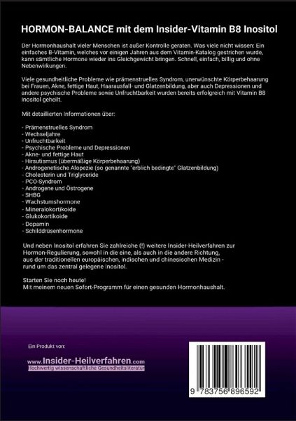Der Hormonhaushalt vieler Menschen ist außer Kontrolle geraten. Was viele nicht wissen: Ein einfaches B-Vitamin, welches vor einigen Jahren aus dem Vitamin-Katalog gestrichen wurde, kann sämtliche Hormone wieder ins Gleichgewicht bringen. Schnell, einfach, billig und ohne Nebenwirkungen.Viele gesundheitliche Probleme wie prämenstruelles Syndrom, unerwünschte Körperbehaarung bei Frauen, Akne, fettige Haut, Haarausfall- und Glatzenbildung, aber auch Depressionen und andere psychische Probleme sowie Unfruchtbarkeit wurden bereits erfolgreich mit Vitamin B8 Inositol geheilt. Mit detaillierten Informationen über:- Prämenstruelles Syndrom- Wechseljahre- Unfruchtbarkeit- Psychische Probleme und Depressionen- Akne- und fettige Haut- Hirsutismus (übermäßige Körperbehaarung)- Androgenetische Alopezie (so genannte "erblich bedingte" Glatzenbildung des Mannes und der Frau)- Cholesterin und Triglyceride- PCO-Syndrom- Androgene und Östrogene- SHBG- Wachstumshormone- Glukokortikoide- Mineralokortikoide- Dopamin- SchilddrüsenhormoneUnd neben Inositol erfahren Sie zahlreiche (!) weitere Insider-Heilverfahren zur Hormon-Regulierung, sowohl in die eine, als auch in die andere Richtung, aus der traditionellen europäischen, indischen und chinesischen Medizin - rund um das zentral gelegene Inositol.Starten Sie noch heute! Mit meinem neuen Sofort-Programm für einen gesunden Hormonhaushalt.