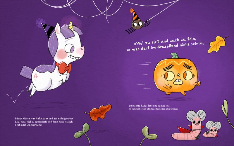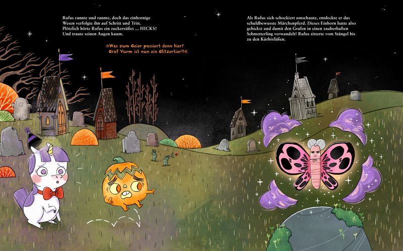 Bald ist Halloween, doch etwas Seltsames geht vor im Gruselland: Das kleine Einhorn Hornbert hat Schluckauf. Aber dies ist kein gewöhnlicher Schluckauf! Denn bei jedem Hicks verwandelt sich etwas Gruseliges in etwas Zuckersüßes - Graf Vurm in einen wunderschönen Schmetterling, das Gruselschloss in eine rosarote Burg ... Nun gilt es, keine Zeit zu verlieren! Und wer könnte da besser helfen als Rufus? Denn der kleine Kürbis kennt sich mit süß-sauren Notfällen bestens aus. Ob Hornbert und Rufus das Gruselland retten können?