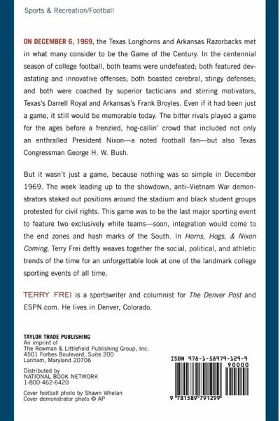 On December 6, 1969, the Texas Longhorns and the Arkansas Razorbacks met in what many consider the game of the century. Both teams were undefeated; both featured devastating and innovative offenses; both boasted stingy defenses; and both were coached by superior tacticians and stirring motivators, Texas's Darrell Royal and Arkansas's Frank Broyles. Moreover, President Richard Nixon was on hand to present his own national championship plaque to the winners. Even if it had been just a game, it would have been memorable today. But it was much more, because nothing was so simple in December 1969. In Horns, Hogs, & Nixon Coming, Terry Frei deftly weaves the social, political, and athletic trends together for an unforgettable look at one of the landmark college sporting events of all time.