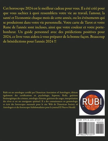 Cet horoscope 2024 est le meilleur cadeau pour vous. Il a été créé pour que vous sachiez à quoi ressemblera votre vie au travail, l'amour, la santé et l'économie chaque mois de cette année, ou les événements qui se produiront dans votre vie personnelle. Votre carte de Tarot et votre Rune de l'année sont incluses, ainsi que votre couleur et votre porte-bonheur. Un guide personnel avec des prédictions positives pour 2024, ce livre vous aidera à vous préparer de la bonne façon. Beaucoup de bénédictions pour l'année 2024 !!