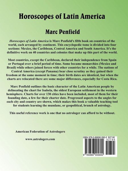 Horoscopes of Latin America is Marc Penfield's fifth book on countries of the world, each arranged by continent. This encyclopedic tome is divided into four sections: Mexico, the Caribbean, Central America and South America. It's the definitive work on 40 countries and colonies that make up this part of the world. Most countries, except the Caribbean, declared their independence from Spain or Portugal over a brief period of time. Some became monarchies (Mexico and Brasil) while others joined forces with other countries for a while. The nations of Central America (except Panama) bear close scrutiny as they gained their freedom at the same moment in time; their birth dates are identical, but when the charts are relocated there are some major differences, especially for Costa Rica. Marc Penfield outlines the basic character of the Latin American people by delineating the chart for Isabela, the oldest European settlement in the western hemisphere. Charts for over 130 cities have been included, most of them for their founding date, a few for their charter date. Progressed aspects to the angles for each city and country are shown, which makes this book a valuable teaching tool for students learning the mundane, or geopolitical, branch of astrology.
