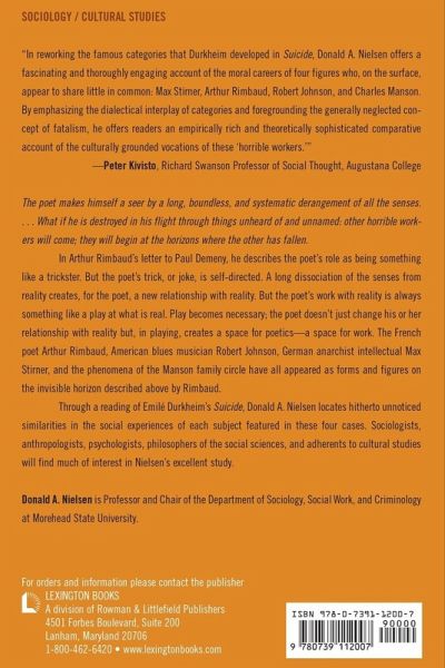 The cultural logic contained within Emile Durkheim's work, specifically categories he puts forth in Suicide, creates the ground for Horrible Workers. This book is constructed to allow its readers to study the cases of Max Stirner, Arthur Rimbaud, Robert Johnson, and the Charles Manson Circle independently of one another or in a comparative fashion. Each case demonstrates in what ways particular social experiences lead to what have been perceived as unique forms of cultural expression.