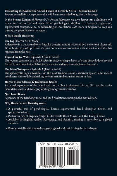 Unleashing the Unknown: A Dark Fusion of Terror & Sci-Fi - Second Edition Prepare yourself for an experience that will haunt your mind long after the last page. In this Second Edition of Horror & Sci-Fiction Magazine, we dive deeper into a chilling world where fear meets the unknown. From psychological thrillers to dystopian nightmares, supernatural conspiracies to mind-bending science fiction, each story is designed to keep you turning the pages late into the night. What's Inside This Issue: The Fog (Horror-Sci-Fi Story) A detective in a quiet rural town finds his peaceful routine shattered by a mysterious phone call. What begins as a whisper from the past becomes a confrontation with an ancient evil that has returned from the mist. Beyond the Ice Wall - Episode 2 (Sci-Fi Serial) The journey continues as a NASA scientist uncovers deeper layers of a conspiracy hidden beyond Earth's frozen boundaries. What lies past the ice wall may alter the fate of humanity. SCHIZOPHRENIA (Psychological Horror Screenplay) Set in the chaotic city of São Paulo, this screenplay explores the fragile mind of Ana, a woman battling loneliness, depression, and the voices inside her head. As her reality collapses, Ana's descent into madness raises one question: when your mind becomes your worst enemy, can you ever escape? The Seven Trumpets - Episode 2 (Horror Serial) The apocalyptic saga intensifies. As the next trumpet sounds, darkness spreads and ancient prophecies come to life, unleashing horrors mankind was never meant to face. Horror Movie Classics & Recommendations A curated exploration of the most iconic horror films in cinematic history. Discover the stories behind the scares and the legacy of the genre's greatest creations. Next Issue Teaser A preview of the terrifying stories and sci-fi revelations coming in the next edition. Why Readers Love This Magazine:A powerful mix of psychological horror, supernatural dread, dystopian fiction, and speculative science. Perfect for fans of Stephen King, H.P. Lovecraft, Black Mirror, and The Twilight Zone. Available in English, Arabic, Portuguese, and Spanish, making it accessible to a global audience. Features serialized fiction to keep you engaged and anticipating the next chapter.