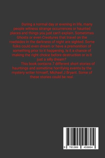 During a normal day or evening in life, many people witness strange occurrences or haunted places and things you just couldn't explain. Sometimes ghosts or even creatures that travel on the roadsides in the darkness of night are sighted. Some folks could even dream or have a premonition of something prior to it happening. Is it a chance of making the right choice before destruction or is it just a silly dream? This book contains 7 different short stories of hauntings and sometimes horrifying events by the mystery writer himself, Michael J Bryant. Some of these stories could be real!