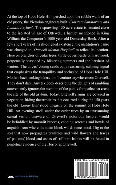 At the top of Hobs Hole Hill, perched upon the rubble walls of an old priory, the Victorian engineers built 'Cloisters Sanatorium and Lunatic Asylum'. The sprawling 150 acre estate is situated close to the isolated village of Ottewell, a hamlet mentioned in King William the Conqueror's 1000 year-old Domesday Book. After a few short years of its ill-omened existence, the institution's name was changed to 'Ottewell Mental Hospital' to reflect its location. Here on branches of cedar trees, turtle doves nestle on hardwood, perpetually seasoned by blistering summers and the harshest of winters. The doves' cooing sends out a reassuring, calming signal that emphasizes the tranquillity and seclusion of Hobs Hole Hill. Modern backpacking hikers don't venture anywhere near Ottewell. They don't dare. Any textbook describing the delights of rambling conveniently ignores the mention of the public footpaths that cross the site of the old asylum. Today, Ottewell's ruins are covered in vegetation, hiding the atrocities that occurred during the 150 years the old 'Loony Bin' stood uneasily on the summit of Hobs Hole Hill. An evening stroll under the cedar trees by an unassuming casual visitor, unaware of Ottewell's notorious history, would be befuddled by moonlit breezes, echoing screams and howls of anguish from where the main block wards once stood. Dig in the soil that now propagates brambles and wild flowers and traces of patients' blood and ashes of stillborn babies will be found in perpetual evidence of the Horror at Ottewell.