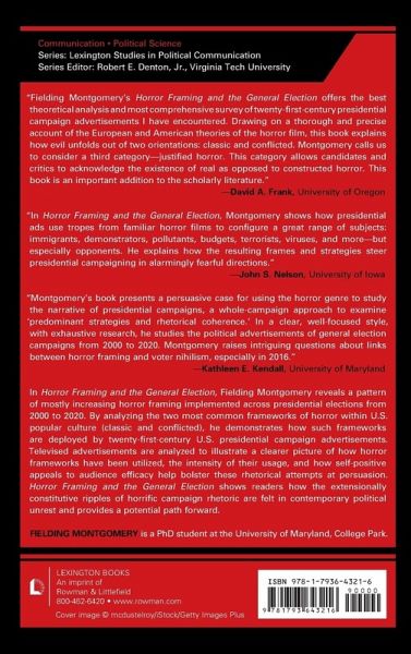 In Horror Framing and the General Election: Ghosts and Ghouls in Twenty-First-Century Presidential Campaign Advertisements, Fielding Montgomery reveals a pattern of mostly increasing horror framing implemented across presidential elections from 2000 to 2020. By analyzing the two most common frameworks of horror within U.S. popular culture (classic and conflicted), he demonstrates how such frameworks are deployed by twenty-first-century U.S. presidential campaign advertisements. Televised advertisements are analyzed to illustrate a clearer picture of how horror frameworks have been utilized, the intensity of their usage, and how self-positive appeals to audience efficacy help bolster these rhetorical attempts at persuasion. Horror Framing and the General Election shows readers how the extensionally constitutive ripples of horrific campaign rhetoric are felt in contemporary political unrest and provides a potential path forward.