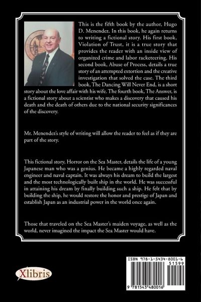This is the fifth book by the author, Hugo D. Menendez. In this book, he again returns to writing a fictional story. His first book, Violation of Trust, it is a true story that provides the reader with an inside view of organized crime and labor racketeering. His second book, Abuse of Process, details a true story of an attempted extortion and the creative investigation that solved the case. The third book, The Dancing Will Never End, is a short story about the love affair with his wife. The fourth book, The Answer, is a fictional story about a scientist who makes a discovery that caused his death and the death of others due to the national security significances of the discovery. Mr. Menendezs style of writing will allow the reader to feel as if they are part of the story. This fictional story, Horror on the Sea Master, details the life of a young Japanese man who was a genius. He became a highly regarded naval engineer and naval captain. It was always his dream to build the largest and the most technologically built ship in the world. He was successful in attaining his dream by finally building such a ship. He felt that by building the ship, he would restore the honor and prestige of Japan and establish Japan as an industrial power in the world once again. Those that traveled on the Sea Masters maiden voyage, as well as the world, never imagined the impact the Sea Master would have.