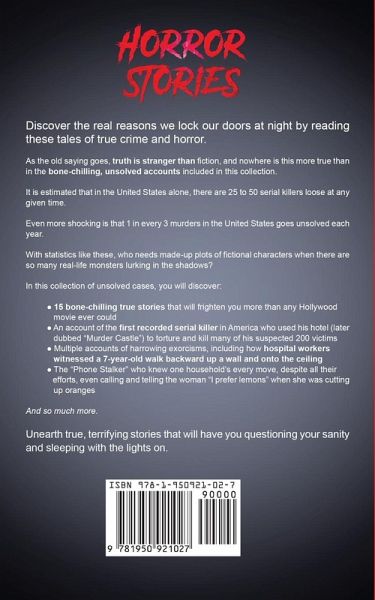 Imagine getting out of the bath and finding blood in four of your six rooms. That's not the plot of a B-movie. That's real life. There's a reason you're drawn to horror films, and they're not as far-fetched as you thought. FBI data shows that 4 out of 10 homicides and 6 out of 10 rapes go unsolved, and this isn't just down to shoddy police work or a failing system. Sometimes, there just is no rational explanation. Have your lights ever flickered inexplicably? Have you ever heard strange noises in your basement? Strange things happen every day, and many of them are never reported. But then, many of them don't end in horror. Some do though, and these are the terrifying true stories that have inspired countless horror movies and thrillers. We're drawn to fiction because it helps us make sense of the world, but unimaginable horror happens all around us more often than we'd like to think. Newspaper clippings, real witness testimonies, and personal accounts tell us that true horror happens all the time, and it's been here for centuries. Through careful research and a thorough review of the evidence, Hannah J. Tidy is about to open your eyes to the chilling reality of the world we live in. You're invited to sit back and listen to a compelling case for why the world is more terrifying than you realized. In Horror Stories: Terrifyingly REAL Stories of True Horror & Chilling Murders, you'll find cases that have left detectives flummoxed for centuries. You'll discover:Over 17 true stories that will convince you that horror movies are more than fiction Key cases that have stumped detectives throughout history The mystery of the Phantom Whistler Why you should be wary of ouija boards The tale of America's first documented serial killer with a body count of over 200 The true story behind 'The Exorcism of Emily Rose' The disturbing truth about the cannibal who killed 21 people in 10 months Why 800 pages of investigation caused police to suspect demonic possession The mysterious disappearance of Timothy Pitzen And much more. If you thought possessed hotels, horrifying mass murders, and creepy online forums came from the imaginations of screenwriters, think again. We tell stories because we want to make sense of the truth. Sometimes, though, the explanation defies rational thought. Horror films portray our worst fears... but our worst fears are not fiction.To delve into terrifyingly true tales of crime and horror, click "Add to Cart" right now. Look over your shoulder. Are you really alone?