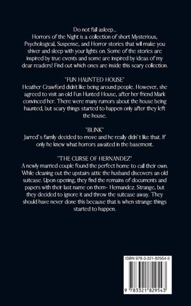 Do not enter... Horrors of the Night is a collection of short Mysterious, Psychological, Suspense, and Horror stories that will make you shiver and sleep with your lights on. Some of the stories are inspired by true events and some are inspired by ideas of my dear readers! Find out which ones are inside this scary collection. "FUN HAUNTED HOUSE" Heather Crawford didn't like being around people. However, she agreed to visit an old Fun Hunted House, after her friend Mark convinced her. There were many rumors about the house being haunted, but scary things started to happen only after they left the house. "BLINK" Jarred`s family decided to move and he really didn`t like that. If only he knew what horrors awaited in the basement. "THE CURSE OF HERNANDEZ" A newly married couple found the perfect home to call their own. While cleaning out the upstairs attic the husband discovers an old suitcase. Upon opening, they find the remains of documents and papers with their last name on them- Hernandez. Strange, but they decided to ignore it and throw the suitcase away. They should have never done this because that is when strange things started to happen. Indulge yourself in some fine suspenseful horror stories!