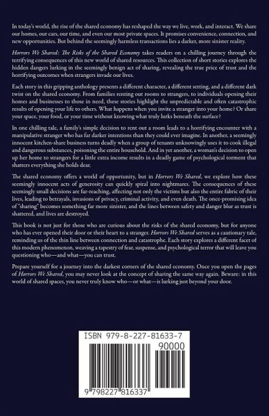 In today's world, the rise of the shared economy has reshaped the way we live, work, and interact. We share our homes, our cars, our time, and even our most private spaces. It promises convenience, connection, and new opportunities. But behind the seemingly harmless transactions lies a darker, more sinister reality. Horrors We Shared: The Risks of the Shared Economy takes readers on a chilling journey through the terrifying consequences of this new world of shared resources. This collection of short stories explores the hidden dangers lurking in the seemingly benign act of sharing, revealing the true price of trust and the horrifying outcomes when strangers invade our lives. Each story in this gripping anthology presents a different character, a different setting, and a different dark twist on the shared economy. From families renting out rooms to strangers, to individuals opening their homes and businesses to those in need, these stories highlight the unpredictable and often catastrophic results of opening your life to others. What happens when you invite a stranger into your home? Or share your space, your food, or your time without knowing what truly lurks beneath the surface? In one chilling tale, a family's simple decision to rent out a room leads to a horrifying encounter with a manipulative stranger who has far darker intentions than they could ever imagine. In another, a seemingly innocent kitchen-share business turns deadly when a group of tenants unknowingly uses it to cook illegal and dangerous substances, poisoning the entire household. And in yet another, a woman's decision to open up her home to strangers for a little extra income results in a deadly game of psychological torment that shatters everything she holds dear. The shared economy offers a world of opportunity, but in Horrors We Shared, we explore how these seemingly innocent acts of generosity can quickly spiral into nightmares. The consequences of these seemingly small decisions are far-reaching, affecting not only the victims but also the entire fabric of their lives, leading to betrayals, invasions of privacy, criminal activity, and even death. The once-promising idea of "sharing" becomes something far more sinister, and the lines between safety and danger blur as trust is shattered, and lives are destroyed. This book is not just for those who are curious about the risks of the shared economy, but for anyone who has ever opened their door or their heart to a stranger. Horrors We Shared serves as a cautionary tale, reminding us of the thin line between connection and catastrophe. Each story explores a different facet of this modern phenomenon, weaving a tapestry of fear, suspense, and psychological terror that will leave you questioning who-and what-you can trust. Prepare yourself for a journey into the darkest corners of the shared economy. Once you open the pages of Horrors We Shared, you may never look at the concept of sharing the same way again. Beware: in this world of shared spaces, you never truly know who-or what-is lurking just beyond your door.