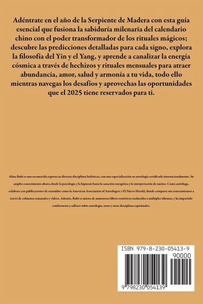 Adéntrate en el año de la Serpiente de Madera con esta guía esencial que fusiona la sabiduría milenaria del calendario chino con el poder transformador de los rituales mágicos; descubre las predicciones detalladas para cada signo, explora la filosofía del Yin y el Yang, y aprende a canalizar la energía cósmica a través de hechizos y rituales mensuales para atraer abundancia, amor, salud y armonía a tu vida, todo ello mientras navegas los desafíos y aprovechas las oportunidades que el 2025 tiene reservados para ti.