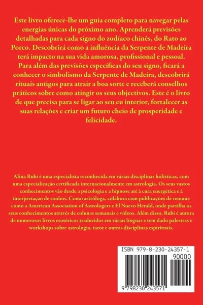 Este livro oferece-lhe um guia completo para navegar pelas energias únicas do próximo ano. Aprenderá previsões detalhadas para cada signo do zodíaco chinês, do Rato ao Porco. Descobrirá como a influência da Serpente de Madeira terá impacto na sua vida amorosa, profissional e pessoal. Para além das previsões específicas do seu signo, ficará a conhecer o simbolismo da Serpente de Madeira, descobrirá rituais antigos para atrair a boa sorte e receberá conselhos práticos sobre como atingir os seus objectivos. Este é o livro de que precisa para se ligar ao seu eu interior, fortalecer as suas relações e criar um futuro cheio de prosperidade e felicidade.