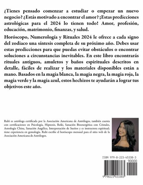 ¿Tienes pensado comenzar a estudiar o empezar un nuevo negocio? ¿Estás motivado a encontrar el amor? ¡Estas predicciones astrológicas para el 2024 lo tienen todo! Amor, profesión, educación, matrimonio, finanzas, y salud. Horóscopo, Numerología y Rituales 2024 le ofrece a cada signo del zodiaco una síntesis completa de su próximo año. Debes usar estas predicciones para que puedas evitar obstáculos o encontrar soluciones a circunstancias inevitables. En este libro encontrarás rituales antiguos, amuletos y baños espirituales descritos en detalle, fáciles de realizar y los materiales disponibles están a mano. Basados en la magia blanca, la magia negra, la magia roja, la magia verde y la magia azul, estos hechizos te ayudarán a lograr tus objetivos este año.