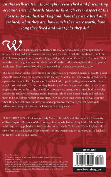 Horses were used for many purposes in Shakespeare's England: for travel, either on horseback or in carriages, for haulage and for pleasure, and for work in the fields. The upper classes were closely involved with horses, for jousting, hunting and racing. Horses was also essential to any army, both as cavalry and to draw supplies and artillery. Horse ownership was, however, much more widespread than might be imagined. Horse and Man in Early Modern England shows how, in pre-industrial England, horses were bred and trained, what they ate, how much they were worth, how long they lived, and what their owners thought of them. While they were named individually, and sometimes became favourites, many were worked hard and poorly treated, leading to their early deaths. They were, nevertheless an essential part of the life of the time and are strikingly depicted in literature and art, as well in many other records.