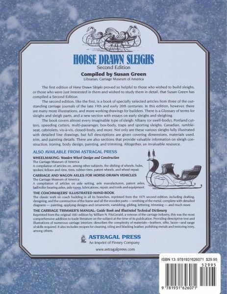 The first edition of Horse Drawn Sleighs proved so helpful to those who wished to build sleighs, or those who were just interested in them and wished to study them in detail, that Susan Green has compiled a Second Edition. The second edition, like the first, is a book of specially selected articles from three of the outstanding carriage journals of the late 19th and early 20th centuries. In this edition, however, there are many more illustrations, and more working drawings for builders. There is a glossary of terms for sleighs and sleigh parts, and a new section with essays on early sleighs and sleighing. The book covers almost every imaginable type of sleigh: Albany (or swell-body), Portland cutters, speeding cutters, multi-passenger, box-body, traps and sporting sleighs, Canadian, rumble-seat, cabriolets, vis-a-vis, closed-body, and more. Not only are these various sleighs fully illustrated with detailed line drawings, but full descriptions are given covering dimensions, materials used, trim, and painting details. There are also sections that provide valuable information on sleigh construction, ironing, body design, painting, and trimming. Altogether, an invaluable resource.