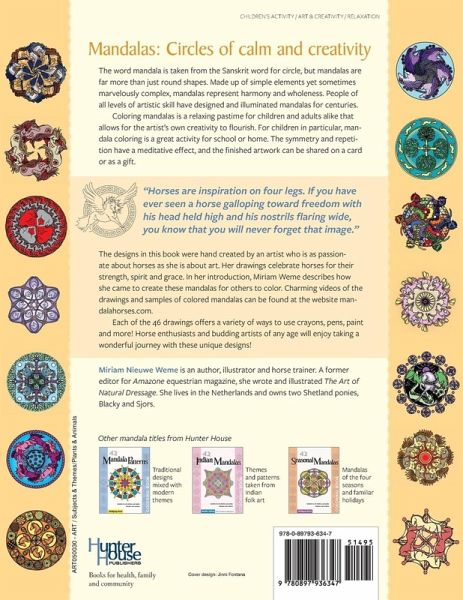 As the author writes in the introduction, "Horses are inspiration on four legs. If you have ever seen a horse galloping towards freedom with his head held high and his nostrils wide open, you know that you will never forget that image." Meanwhile, designing and coloring mandalas is an activity that has been around for centuries. The 46 original designs in this charming coloring book bring together the inspiration of horses -- their beautiful lines, thrilling movement and sense of freedom -- with the centering esthetic and timeless beauty of mandalas. Author, illustrator, and horse trainer Miriam Nieuwe Weme created these patterns using images of horses and the traditional rotational symmetry of the mandala design. Some of the horse mandalas are complex and intricate, others are simpler, awaiting the addition of reader's own embellishments and creativity. Miriam Weme has loved horses since she was a little girl. Creating the mandalas featured in this book was a profoundly comforting and inspirational experience for her, and she hopes readers/artists interacting with the book will have the same experience as they color them in and make them their own. Whether horse enthusiast, budding artist, adult or child, this coloring and design book gives readers an opportunity to bring out colored pencils and paints and let these unique mandalas take them on a wonderful journey!