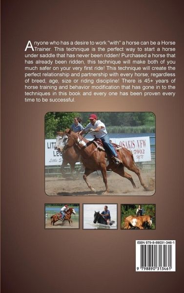Anyone who has a desire to work "with" a horse can be a Horse Trainer. This technique is the perfect way to start a horse under saddle that has never been ridden! Purchased a horse that has already been ridden, this technique will make both of you much safer on your very first ride! This technique will create the perfect relationship and partnership with every horse; regardless of breed, age, size, or riding discipline! There is 45+ years of horse training and behavior modification that has gone into the techniques in this book and everyone has been proven every time to be successful.