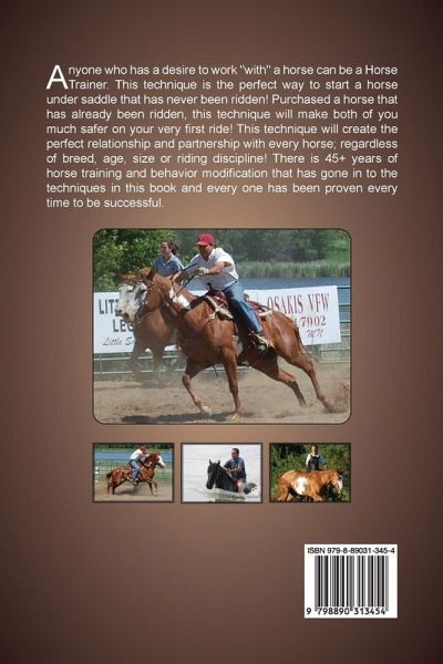 Anyone who has a desire to work "with" a horse can be a Horse Trainer. This technique is the perfect way to start a horse under saddle that has never been ridden! Purchased a horse that has already been ridden, this technique will make both of you much safer on your very first ride! This technique will create the perfect relationship and partnership with every horse; regardless of breed, age, size, or riding discipline! There is 45+ years of horse training and behavior modification that has gone into the techniques in this book and everyone has been proven every time to be successful.