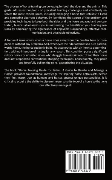 The process of horse training can be vexing for both the rider and the animal. This guide addresses hundreds of prevalent training challenges and effectively resolves the most critical issues, including managing a horse that refuses to listen and correcting aberrant behavior. By identifying the source of the problem and providing techniques to keep both the rider and the horse engaged and concentrated, Jessica Jahiel assists you in maximizing the benefits of your training sessions by emphasizing the significance of enjoyable surroundings, effective communication, and attainable objectives. A frequent issue arises when a horse rides away from the familiar barn or companions without any problems. Still, whenever the rider attempts to turn back towards home, the horse suddenly bolts. He accelerates with an intense determination, with no intention of halting for any reason. This condition poses a significant risk for novice or unskilled riders who struggle to maintain control and their horse does not respond to conventional stopping techniques. Consequently, they panic and forcefully pull on the reins, exacerbating the situation. The book "Horse Training Guide for Riders: A Guide to Handle and Manage a Horse" provides foundational knowledge for aspiring horse enthusiasts before their first lesson. Just as humans and horses possess unique personalities, it is critical to acquire the ability to discern the personality type of a horse so that one can effectively manage it.