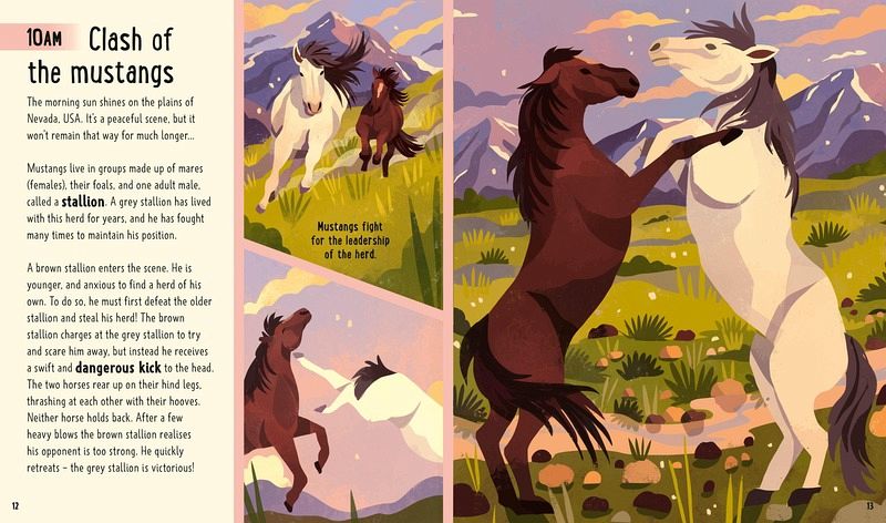 A beautifully illustrated non-fiction story following wild horses like mustangs, zebras, donkeys, and ponies over the course of one day.