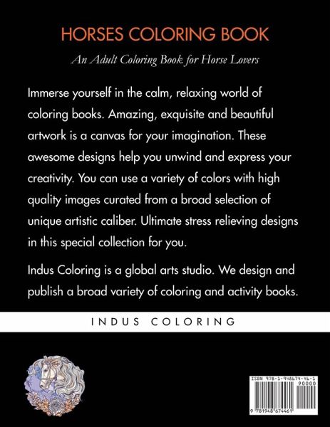 Horses Coloring Book: An Adult Coloring Book for Horse Lovers Immerse yourself in the calm, relaxing world of coloring books. Amazing, exquisite and beautiful artwork is a canvas for your imagination. These awesome designs help you unwind and express your creativity. You can use a variety of colors with high quality images curated from a broad selection of unique artistic caliber. Ultimate stress relieving designs in this special collection for you. Indus Coloring is a global arts studio. We design and publish a broad variety of coloring and activity books.