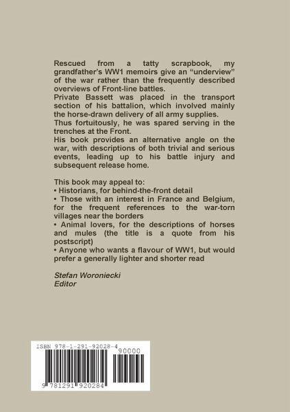 Rescued from a tatty scrapbook, my grandfather's WW1 memoirs give an "underview" of the war rather than the frequently described overviews of Front-line battles. Private Bassett was placed in the transport section of his battalion, which involved mainly the horse-drawn delivery of all army supplies. Thus fortuitously, he was spared serving in the trenches at the Front. His book provides an alternative angle on the war, with descriptions of both trivial and serious events, leading up to his battle injury and subsequent release home. This book may appeal to: ¿ Historians, for behind-the-front detail ¿ Those with an interest in France and Belgium, for the frequent references to the war-torn villages near the borders ¿ Animal lovers, for the descriptions of horses and mules (the title is a quote from his postscript) ¿ Anyone who wants a flavour of WW1, but would prefer a generally lighter and shorter read Stefan Woroniecki Editor