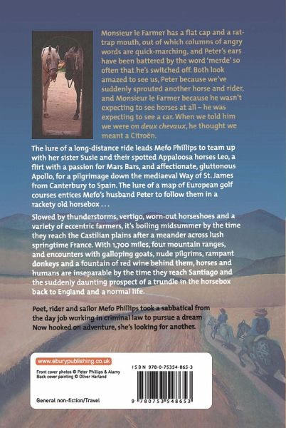 The lure of a long-distance ride leads Mefo Phillips to team up with her sister Susie and their spotted Appaloosa horses Leo a flirt with a passion for Mars Bars and affectionate gluttonous Apollo for a pilgrimage down the medievil Way of St.James from Canterbury to Spain. The lure of a map of European glof courses entices Mefo's husband Peter to follow them in a rackety old horsebox... Slowed by thunderstorms vertigo worn-out horseshoes and a variety of eccentric farmers it's boiling midsummer by the time they reach the Castilian plains after a meander across lush springtime France. With 1 700 miles four mountain ranges and encounters with galloping goats nude pilgrims rampant donkeys and a fountain of red wine behind them horses and humans are inseparable by the time they reach Santiago and the suddenly daunting prospect of a trundle in the horsebox back to England and a normal life.