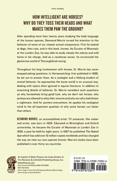 How intelligent are horses? Why do they toss their heads and what makes them paw the ground? After spending more than twenty years studying the body language of the human species, Desmond Morris turned his attention to the behavior of some of our closest animal companions. First he looked at dogs, then cats, and in this book, horses. As Curator of Mammals at the London Zoo, he was able to study closely the zebras and wild horse in his charge. And as a racehorse owner, he scrutinized the glamorous world of Thoroughbred racing. Throughout his long involvement with horses, Desmond Morris has never stopped asking questions. In Horsewatching, first published in 1988, he set out to answer them. As a zoologist and a lifelong student of animal behavior, he approaches the horse world in an unusual way, dealing with topics often ignored in equine literature. In addition to examining details of behavior, Dr Morris considers such questions as why horseshoes bring good luck, why we don’t eat horses, why jockeys are allowed to whip their mounts and why we call a bad dream a nightmare. And for punters everywhere, he applies his zoological mind to the all-important question of why some horses run faster than others.