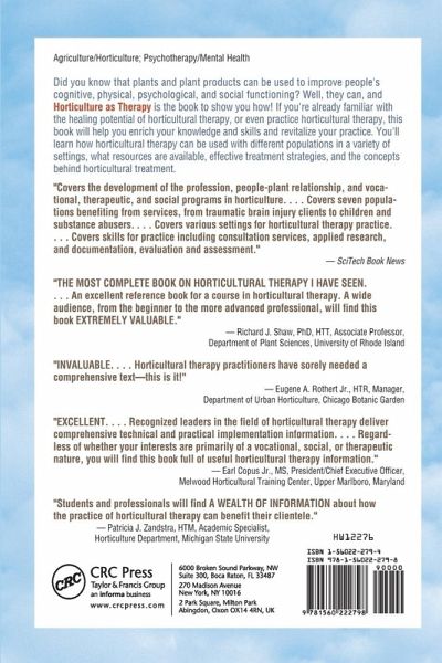 Contents Introduction Part I: The Practice of Horticultural Therapy Development of the Profession of Horticultural Therapy Practice People-Plant Relationship Vocational Social and Therapeutic Programs in Horticulture Part II: Specialized Populations for Horticultural Therapy Practice Stroke Spinal Chord Physical Disabilities and Horticultural Therapy Practice Traumatic Brain Injury and Horticultural Therapy Practice Developmental Disabilities and Horticultural Therapy Practice Mental Illness and Horticultural Therapy Practice Children and Youth and Horticultural Therapy Practice Older Persons and Horticultural Therapy Practice Substance Abuse and Criminal Behavior and Horticultural Therapy Practice Part III: Settings for Horticultural Therapy Practice Outside Space and Adaptive Gardening: Design Techniques and Tools Inside Space and Adaptive Gardening: Design Techniques and Tools Botanical Gardening: Design Techniques and Tools Community Gardening: Design Techniques and Tools Part IV: Skills for Horticultural Therapy Practice Consultation Services for Horticultural Therapy Practice Applied Research for Horticultural Therapy Practice Documentation Program Evaluation and Assessment Horticultural Therapy Practice in the Future Part V: Appendices Index Reference Notes Included