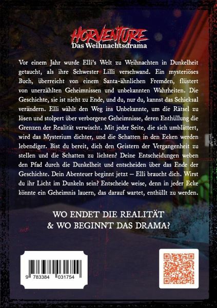 Vor einem Jahr versank Elli's Welt zu Weihnachten in Dunkelheit, als ihre Schwester Lilli spurlos verschwand. Ein mysteriöses Buch, überreicht von einem Santa-ähnlichen Fremden, flüstert von Geheimnissen, die niemand zuvor zu ergründen wagte. Doch die Geschichte ist noch lange nicht zu Ende. Nur du kannst entscheiden, wie sie weitergeht. Auf ihrer Reise ins Unbekannte wird Elli mit verborgenen Wahrheiten konfrontiert, die die Grenzen zwischen Realität und Albtraum verwischen. Mit jeder Seite, die sich umblättert, wird das Geheimnis dichter, die Schatten lebendiger. Dezente Illustrationen auf…mehr