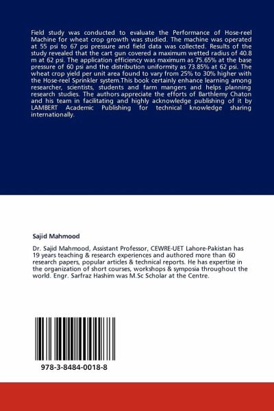 Field study was conducted to evaluate the Performance of Hose-reel Machine for wheat crop growth was studied. The machine was operated at 55 psi to 67 psi pressure and field data was collected. Results of the study revealed that the cart gun covered a maximum wetted radius of 40.8 m at 62 psi. The application efficiency was maximum as 75.65% at the base pressure of 60 psi and the distribution uniformity as 73.85% at 62 psi. The wheat crop yield per unit area found to vary from 25% to 30% higher with the Hose-reel Sprinkler system.This book certainly enhance learning among researcher, scientists, students and farm mangers and helps planning research studies. The authors appreciate the efforts of Barthlemy Chaton and his team in facilitating and highly acknowledge publishing of it by LAMBERT Academic Publishing for technical knowledge sharing internationally.